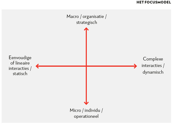 Afhankelijk van het incident en de bevindingen kan ik meerdere methoden en modellen hanteren. Het focusmodel op het plaatje geeft de relevante dimensies weer die bij een onderzoek een rol spelen.